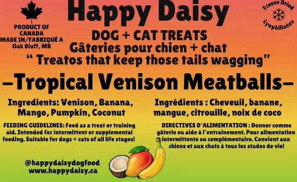 Our freeze dried Tropical Venison Meatball treats are a delicious and nutritious option for your pet. Made with human grade venison, banana, coconut, mango and pumpkin, they offer a rich and flavourful taste that your dog will love. Each bite is packed with protein and essential nutrients and vitamins making them a healthy choice for rewarding or training your pet.